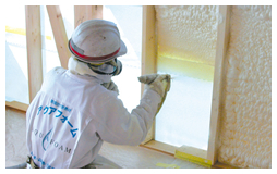 住宅の隅から隅まで家全体をすっぽり覆ってしまう吹付硬質ウレタンフォームを使用しています。現場吹付発泡による工事を行います。躯体にしっかり接着するので、すき間なく充填できるため、高断熱・高気密の省エネ住宅を実現できます。また透湿性が低く断熱内部に湿気を侵入させないため、躯体内の結露を防止し建物の耐久性も高めます。