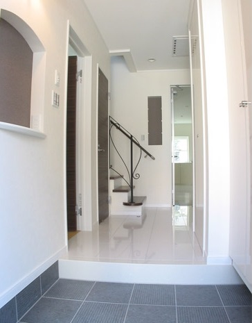 LDKの床は白く輝くタイル貼り。まるで大理石のよう。